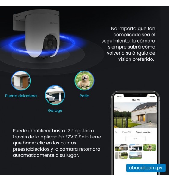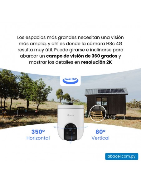 La cámara EZVIZ CS-H8c-R200-1K3KFL4GA es una solución de seguridad exterior que opera sin necesidad de Wi-Fi, utilizando conectividad 4G para ofrecer vigilancia continua en áreas remotas o con acceso limitado a redes inalámbricas. Equipada con resolución 2K, proporciona imágenes nítidas y detalladas. Su capacidad de movimiento horizontal de 350° y vertical de 80° permite una cobertura panorámica de 360°, reduciendo los puntos ciegos. Incorpora tecnología de inteligencia artificial para la detección precisa de personas y vehículos, minimizando falsas alarmas. Además, cuenta con seguimiento automático de objetos en movimiento, visión nocturna en color gracias a reflectores integrados, defensa activa mediante sirena y luces estroboscópicas, comunicación bidireccional y opciones de almacenamiento en tarjeta microSD de hasta 512 GB o en la nube a través de EZVIZ CloudPlay. Su diseño resistente a la intemperie la hace ideal para diversas condiciones climáticas.