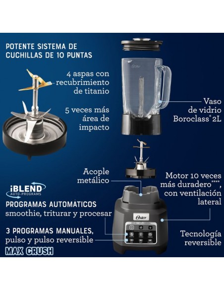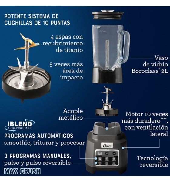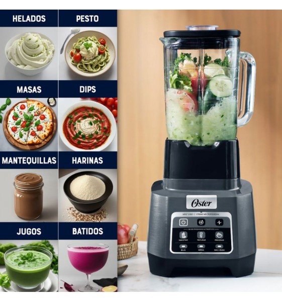 La licuadora profesional Oster Xtreme Mix incorpora la innovadora tecnología Titanium Blade, equipada con una cuchilla de 4 niveles y 10 aspas. Este diseño avanzado permite ofrecer hasta cinco veces más área de impacto durante el procesamiento de los alimentos, lo que mejora significativamente la eficiencia al triturar, mezclar y licuar diferentes ingredientes, logrando preparaciones más homogéneas y consistentes.